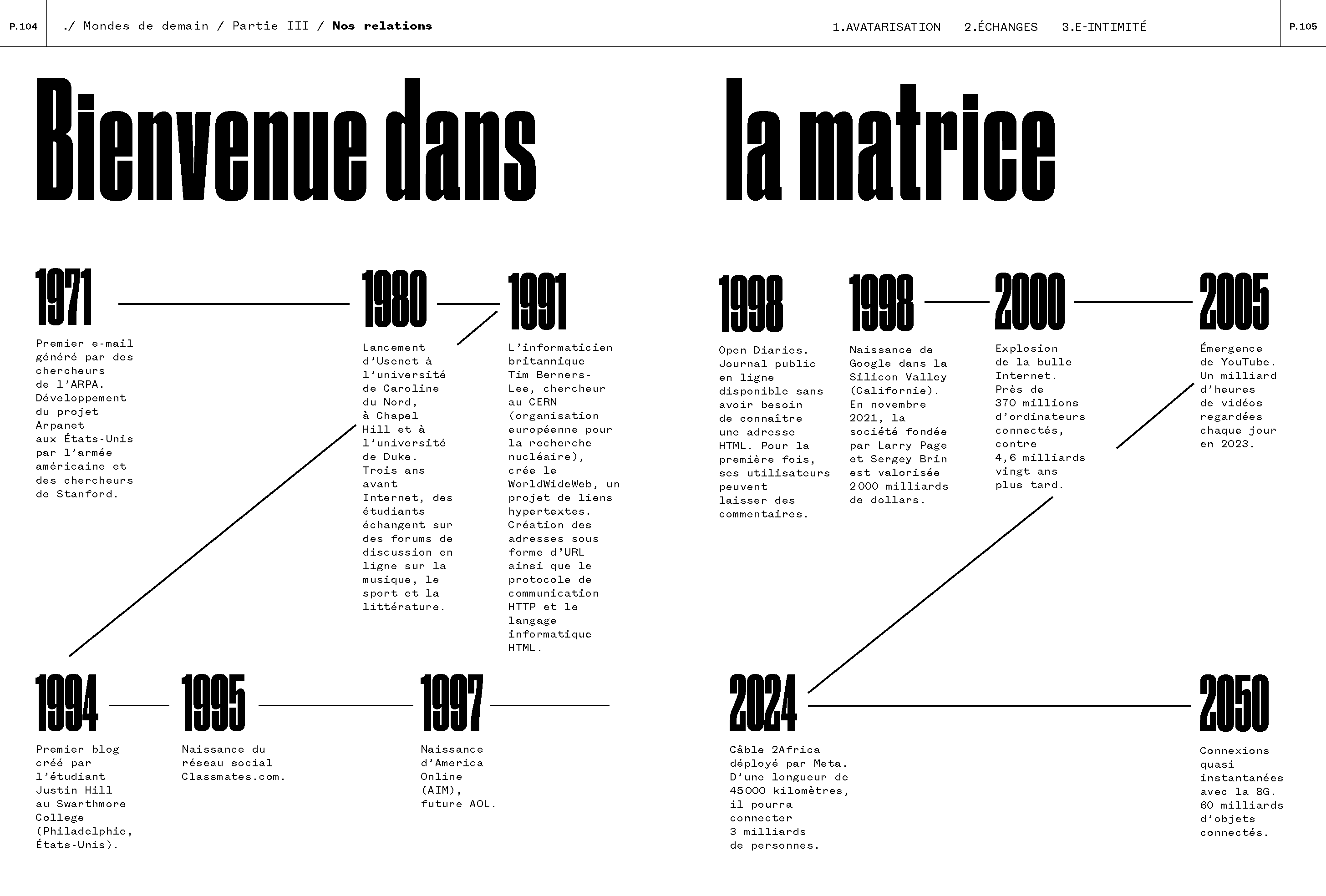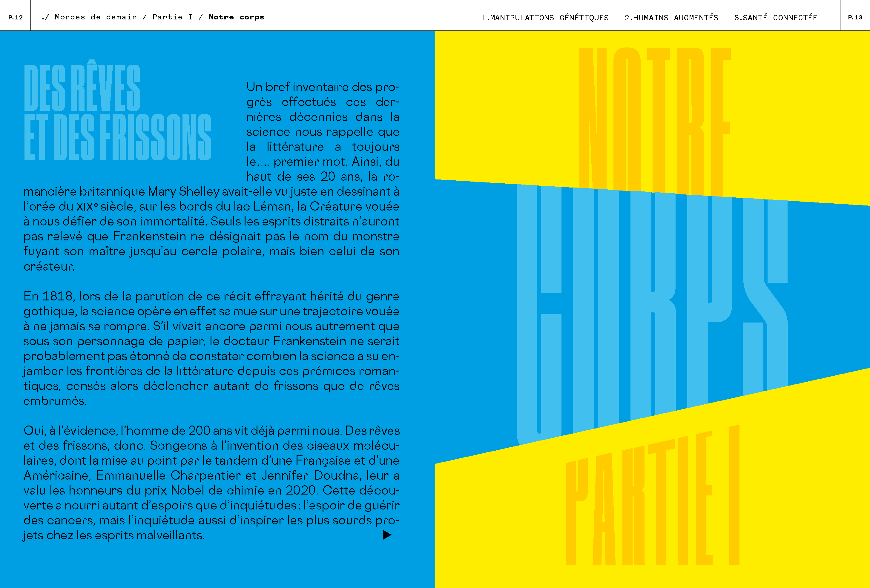Very colorful, it is made up of nearly 150 articles divided into 7 parts – Our body, Our society, Our relationships, Our playgrounds, Our well-being, Our new conquests, Our planet – and interviews with pioneers and experts, including: scientist and astronaut Claudie Haigneré; the computer scientist Gérard Le Lann, one of the creators of the Internet; the musician Jean-Michel Jarre; infectious disease specialist Anne-Claude Crémieux; the adventurer and inventor Bertrand Piccard; the scientist and former director of the European Space Agency Jean-Jacques Dordain…